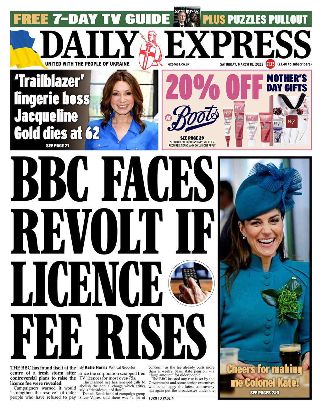The BBC is facing a revolt after controversial plans to raise the licence fee were revealed, the Daily Express reports. The paper says the planned rise has renewed calls to scrap the annual charge. Head of campaign group Silver Voices, Dennis Reed, said there was a lot of concern because the licence fee already costs more than a week’s basic state pension.