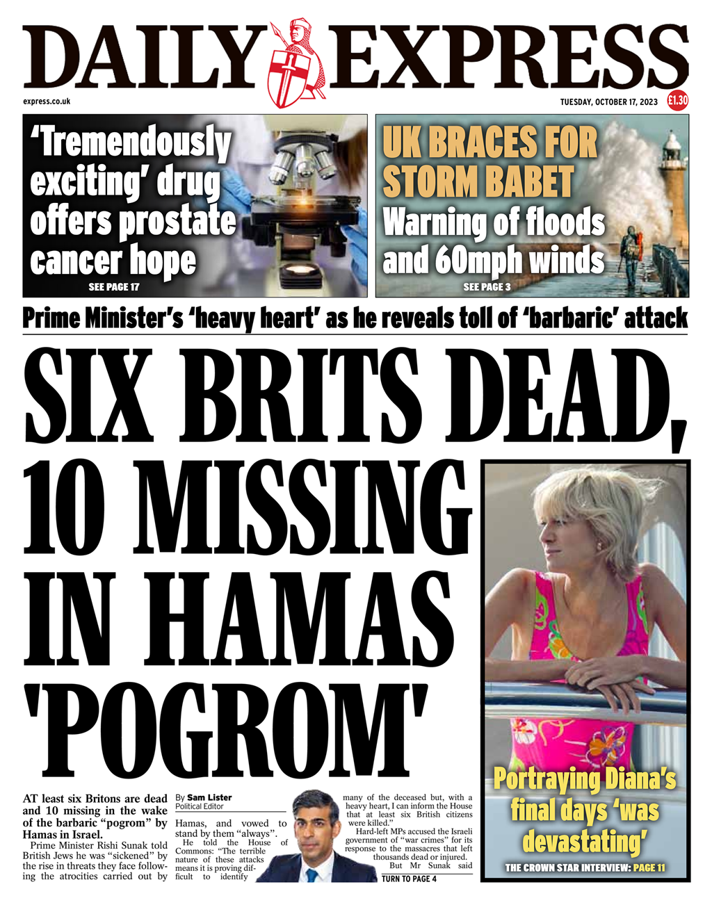 The number of Brits missing or confirmed dead after the Hamas attacks in Israel makes the front of the Daily Express. The paper says Mr Sunak has told Jewish people in Britain that he was “sickened” by the rise in threats against them following the attacks, and has vowed to stand by them “always”. Also on the front are warnings of floods and 60mph winds as the UK braces for Storm Babet.