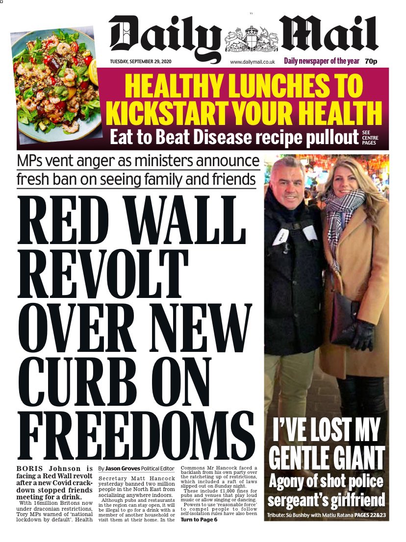 The Daily Mail leads on a possible revolt by Tory MPs, including some of those who helped secure last year’s majority by winning long-held Labour seats, over the government’s proposed new coronavirus restrictions.
