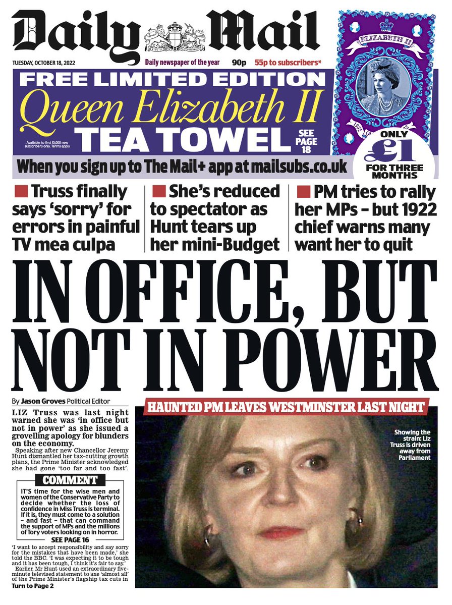 Ms Truss was warned on Monday night that she was “in office but not in power”, says the Daily Mail. The PM acknowledged that she had gone “too far and too fast” with her economic strategy and has been trying to rally support from her MPs, the paper reports.
