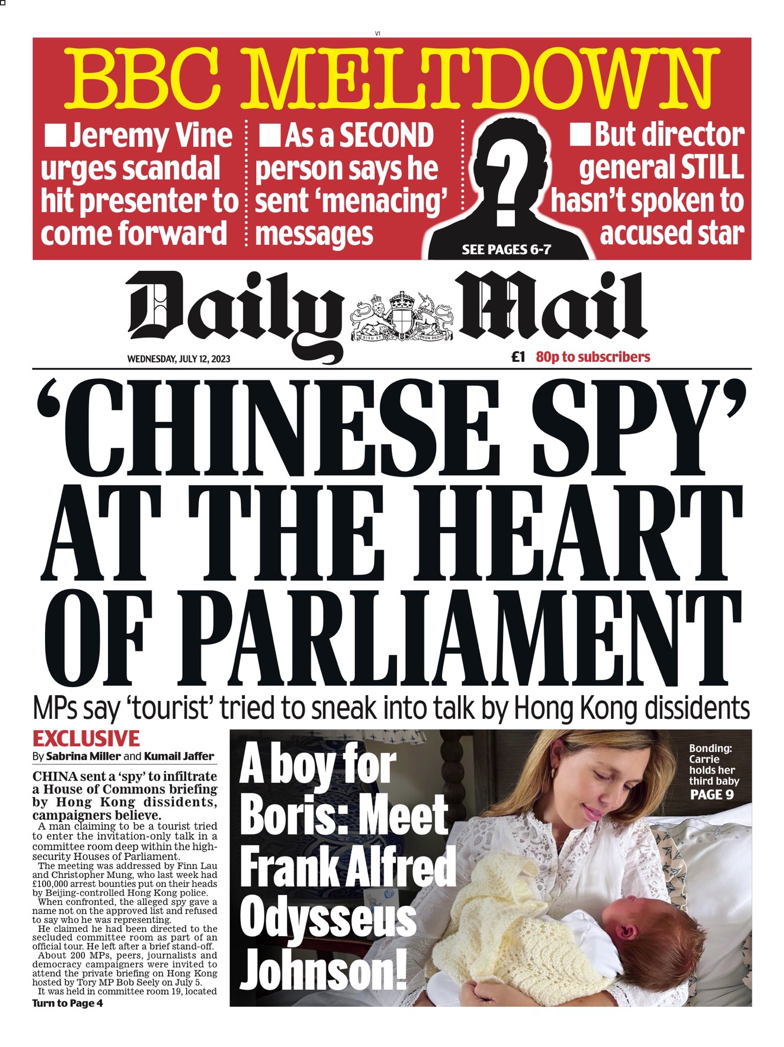 The Daily Mail carries an exclusive on a “Chinese spy at the heart of parliament”. It reports that China sent a spy to a House of Commons briefing led by Hong Kong dissidents. It said the man “claimed to be a tourist” before he was promptly ejected from the meeting.