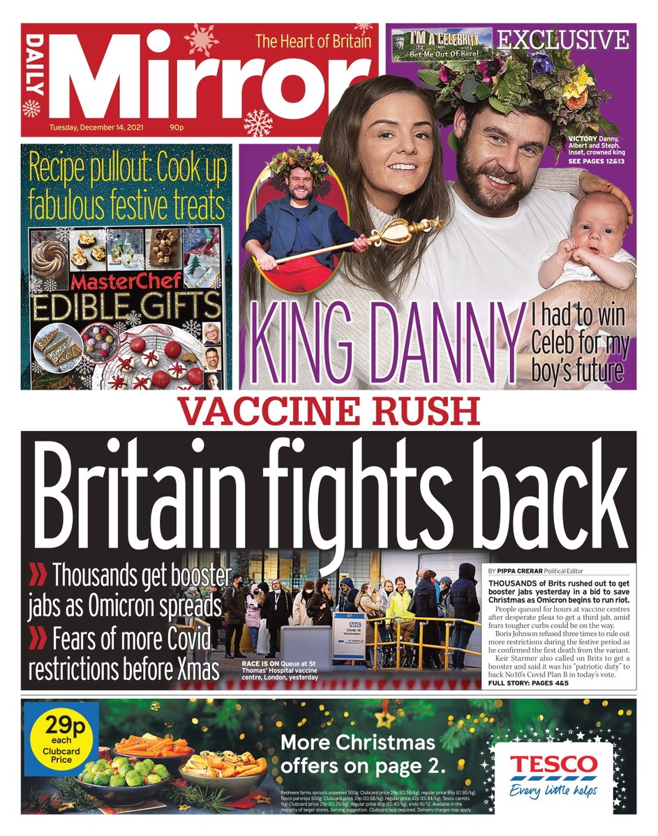 “Britain fights back” is how the Daily Mirror describes the rush for booster vaccinations, with one such queue – at St Thomas’s hospital in central London – pictured on its front page.