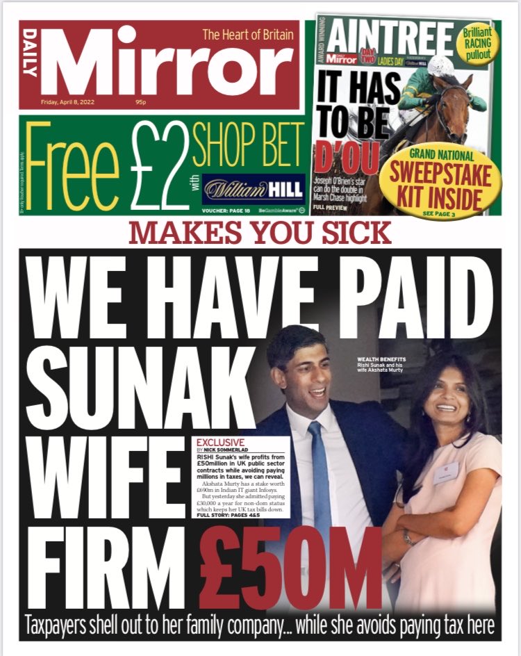 The Daily Mirror’s splash pulls no punches in its take on Ms Murty’s tax affairs, saying revelations that she profits from public sector contracts paid to her family’s company while “avoiding paying millions in taxes” – are enough to “make you sick”.