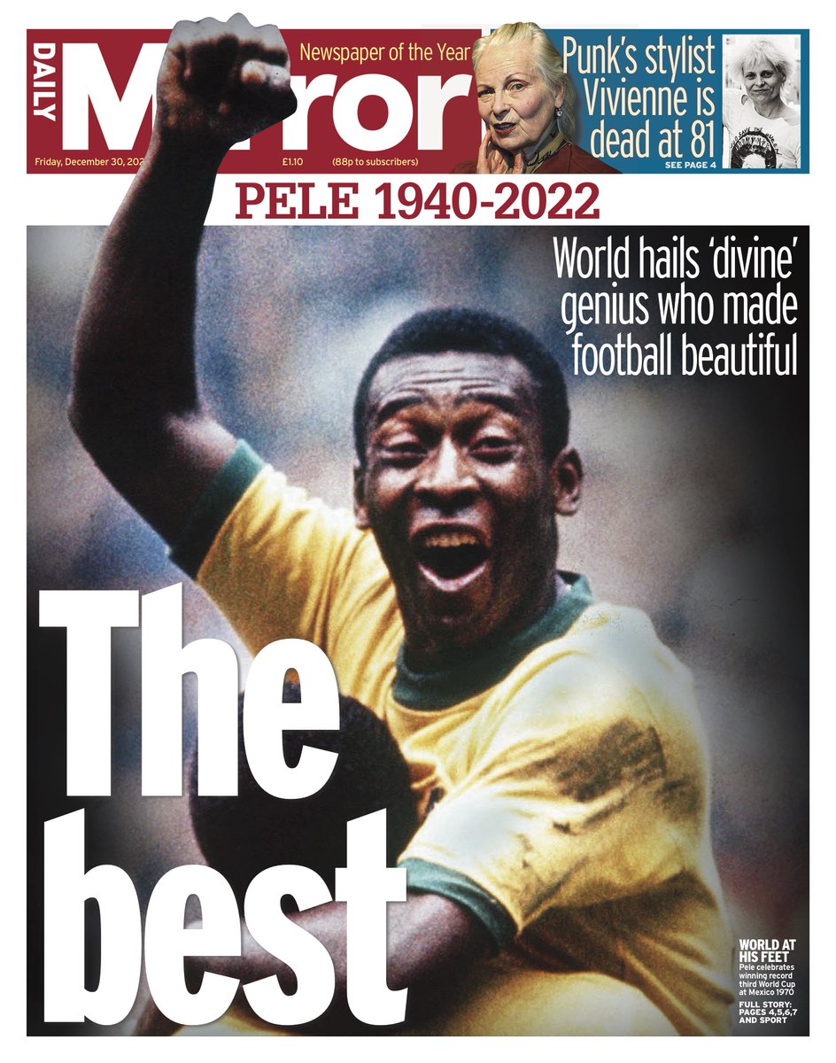 The death of Brazilian footballing icon Pele dominates the images on the front pages of the papers, alongside tributes to his legendary career and unprecedented three men’s World Cup victories. The Daily Mirror devotes its whole front page to a picture of him being held aloft after his final tournament triumph in Mexico in 1970, describing him as a “divine genius who made football beautiful”.