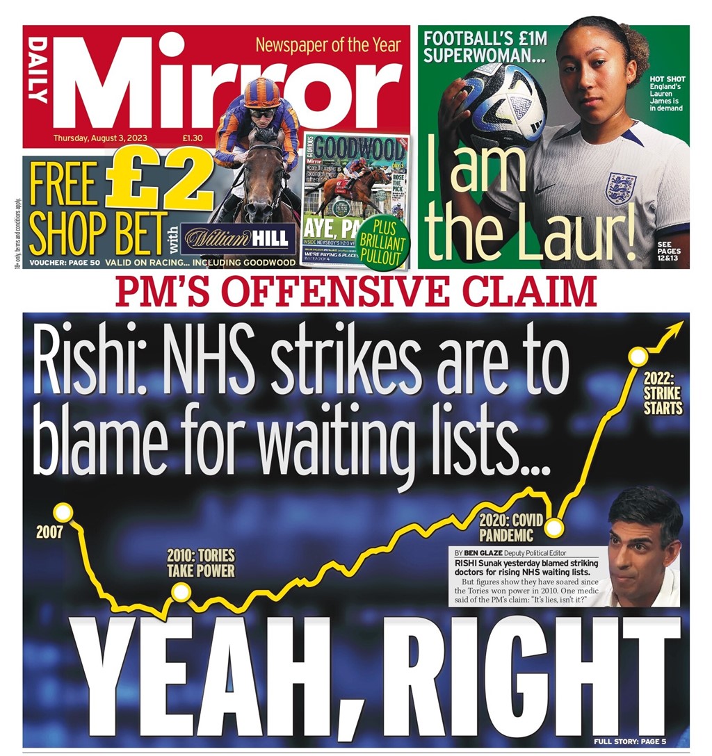 The Daily Mirror takes aim at comments made by Rishi Sunak blaming striking doctors for rising NHS waiting lists. A timeline graphic on the front of the tabloid appears to show waiting lists going up long before strikes began in 2022. The paper also makes space for this year’s memorable World Cup – with England’s Lauren James, who’s “in demand”, featured on the masthead.