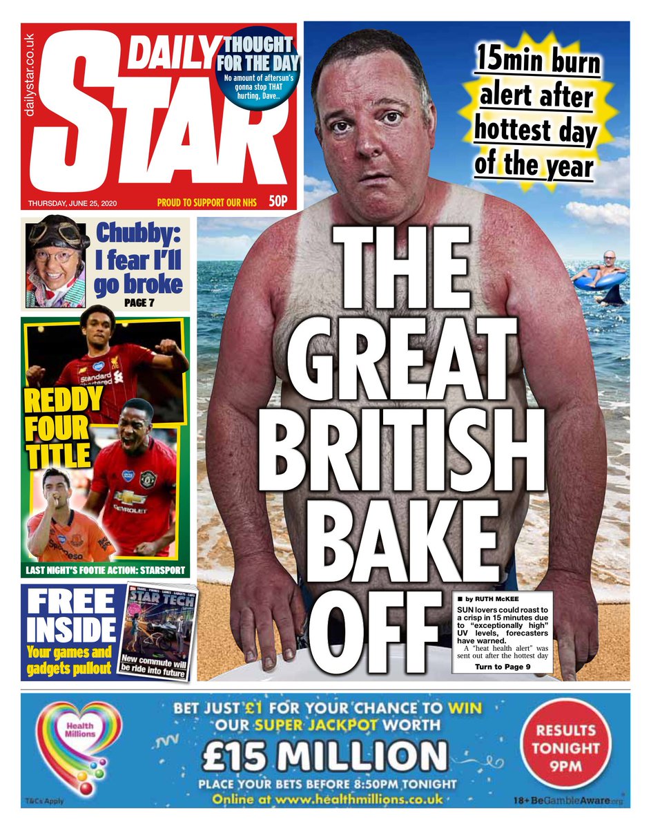 “The Great British Bake Off” puns the Daily Star, aside a man looking miffed at his extreme sunburn. Sun-lovers could “roast to a crisp” in 15 minutes due to exceptionally high UV levels, the paper reports forecasters as saying.