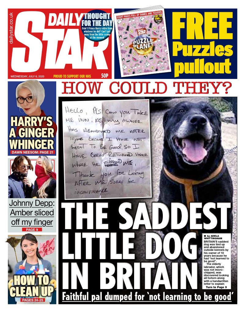 And the Daily Star front page focuses on the tale of a dog abandoned by his owner after 10 years because he had not “learned to be good”, according to a note left behind. “How could they?” asks the paper, dubbing the black Labrador “the saddest little dog in Britain”.