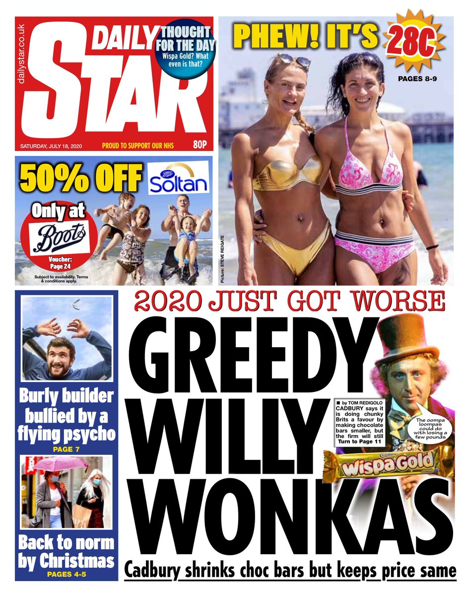 And finally, “Greedy Willy Wonkas” is the headline on the front page of the Daily Star, as the paper reports that Cadbury plans to reduce the size of its chocolate bars but keep the same price. “2020 just got worse,” the paper says.