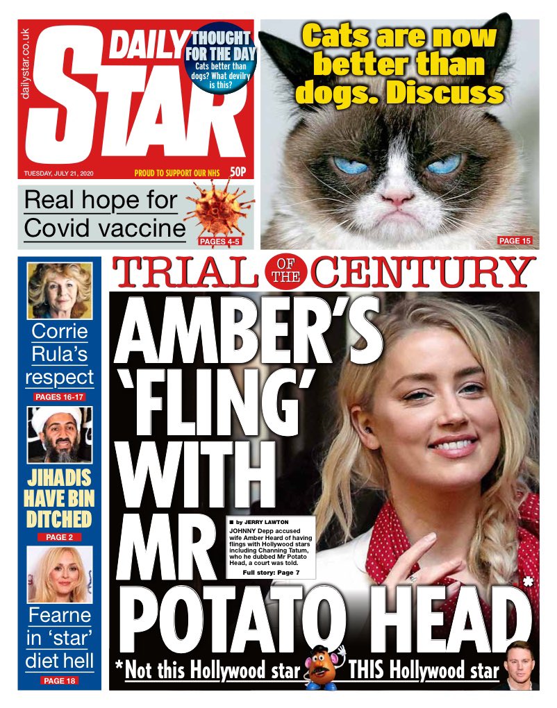 Finally, the Daily Star reports Ms Heard’s testimony during the libel trial at the High Court in London. It reports Ms Heard’s claim that Mr Depp accused her of having an affair with actor Channing Tatum – whom the court heard Mr Depp dubbed “Mr Potato Head”.
