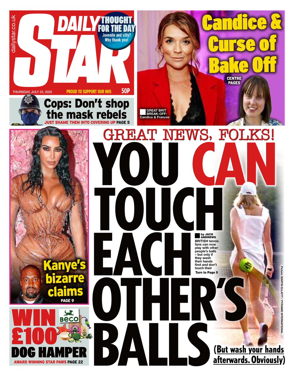 Finally, the Daily Star appears pleased with news that tennis players can now touch other players’ balls during matches – but only if they wash hands and avoid touching their face.
