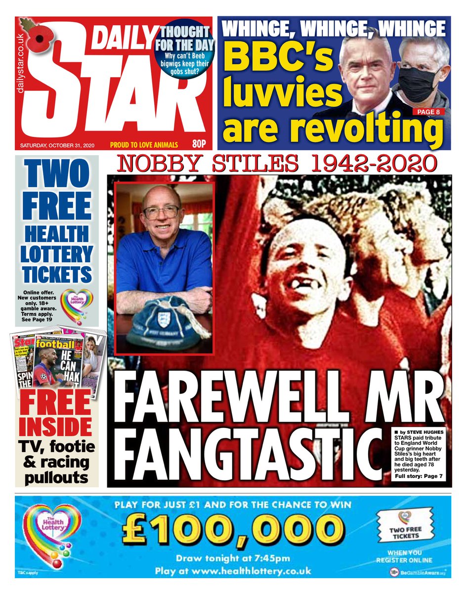 And the Daily Star leads with “farewell Mr Fantastic” in honour of Stiles, with stars paying tribute to the England footballer, who died at the age of 78.