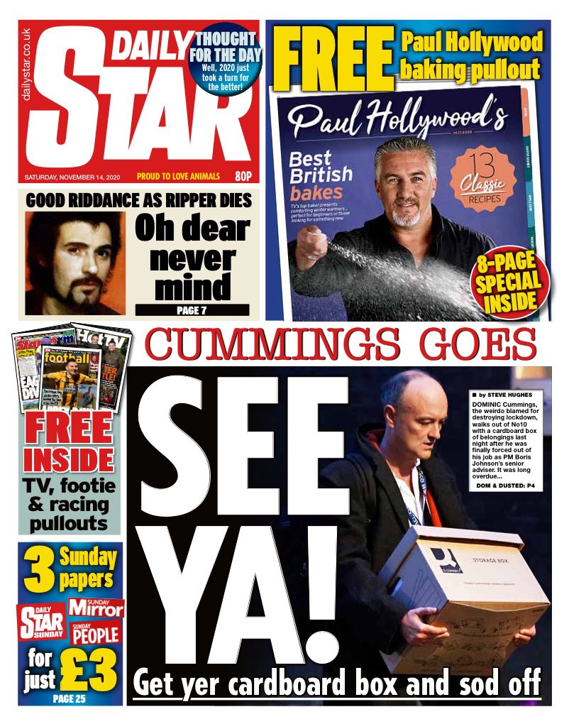 “See ya!” says the Daily Star, which has mounted a campaign of sorts against Mr Cummings in recent months. It describes the departing aide as “the weirdo blamed for destroying lockdown”. His exit is “long overdue”, the paper adds.