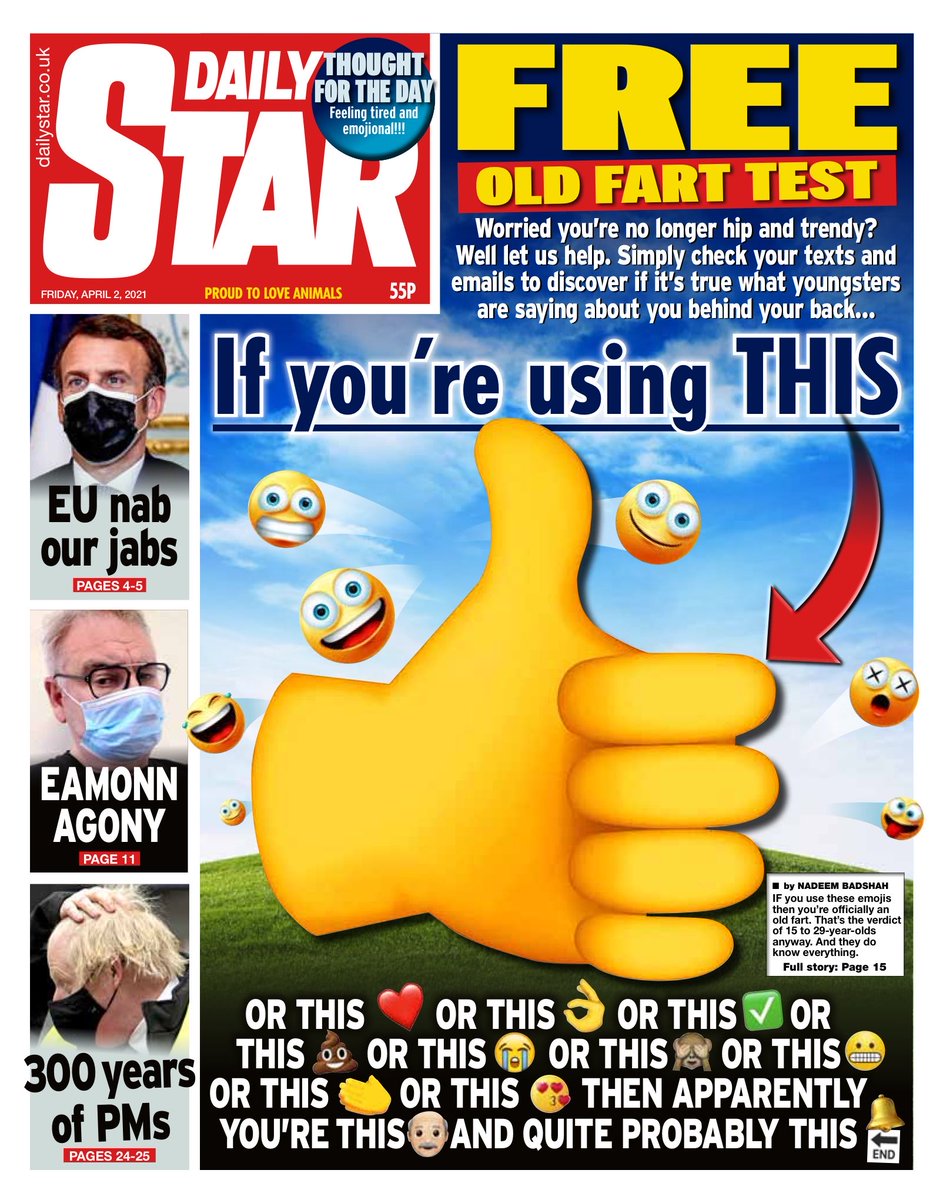 Finally, a giant, yellow thumbs up dominates the front of the Daily Star, with the paper reporting that the emoji – and several others – fall foul of the “hip and trendy” test and is actually a signal of your age.