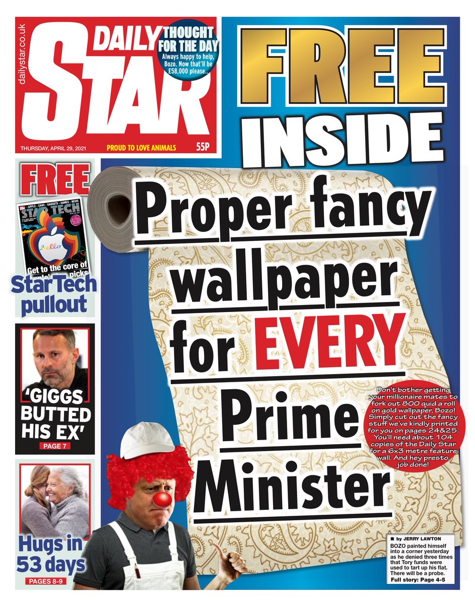 The Daily Star offers its readers “proper fancy wallpaper” of the kind said to be favoured by Mr Johnson and Ms Symonds in a two-page pullout. The paper helpfully advises readers that they only need to buy 104 copies of the paper in order to decorate a 6m x 3m room.