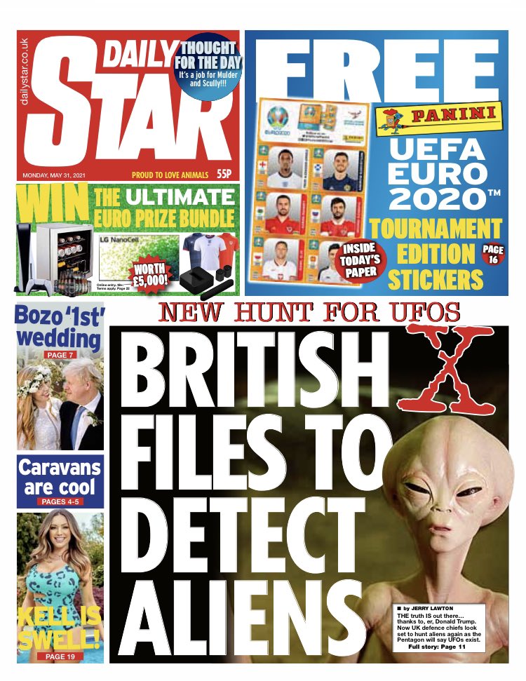 And the Daily Star leads on what it calls a “British X-files to detect aliens”, saying that UK defence chiefs could restart their UFO desk following publication of a forthcoming Pentagon report into “unidentified aerial phenomena”. It was ordered last year by the former president, prompting the paper to conclude: “The truth IS out there… thanks to, er, Donald Trump.”