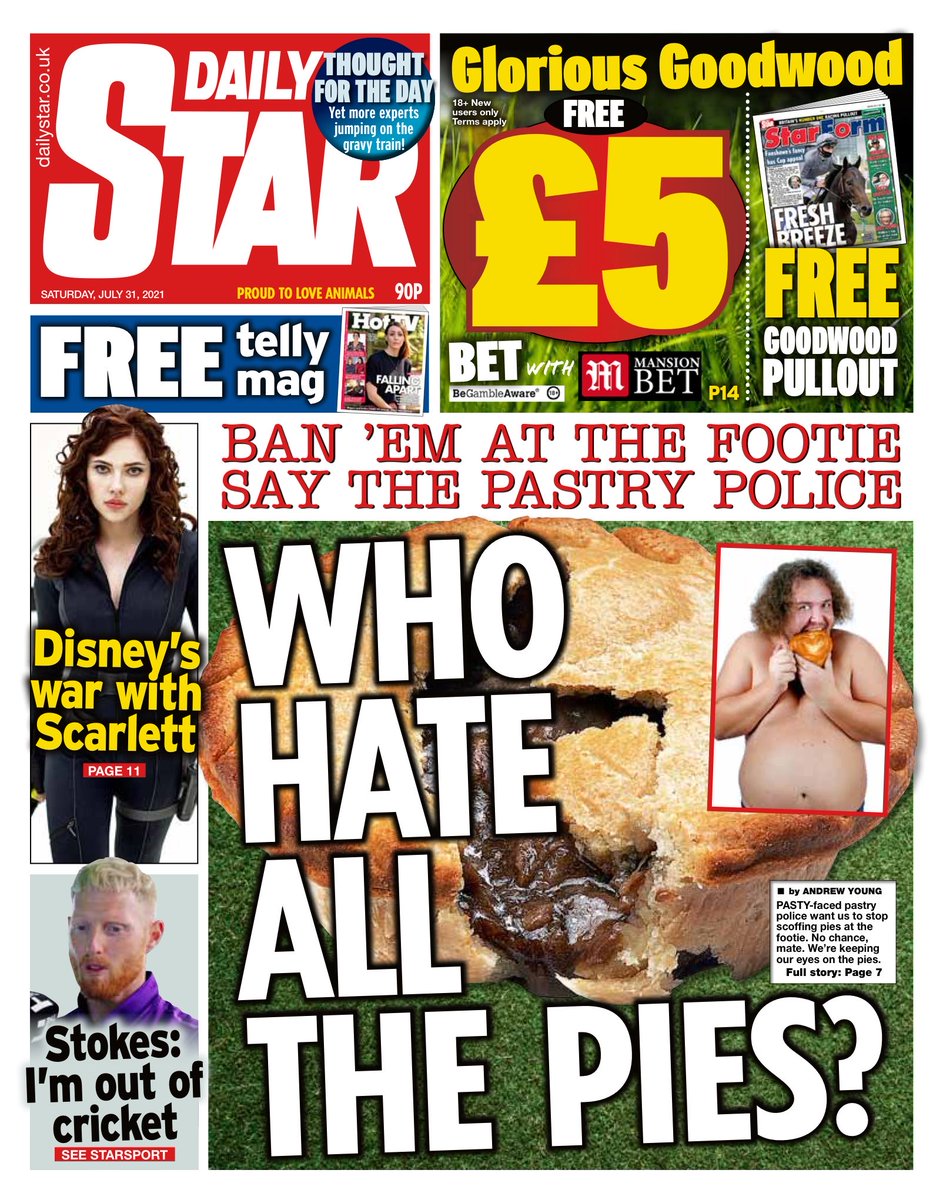 The Daily Star is unhappy with attempts by the “pastry police” to ban pies at football matches, as it makes clear with its headline: “Who hate all the pies?”
