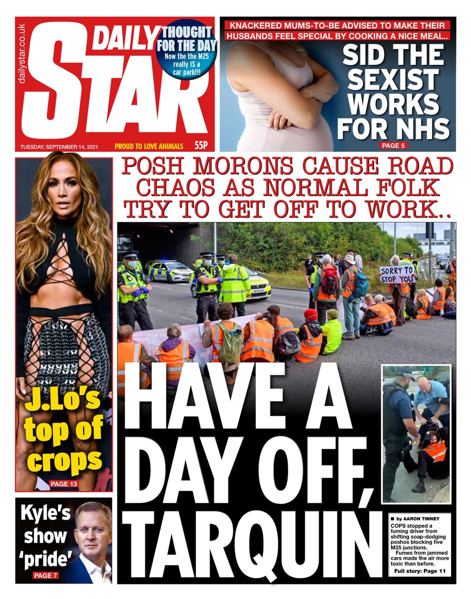 Finally, “have a day off, Tarquin” is the headline in the Daily Star, which suggests “posh morons” caused road chaos on Monday as “normal folk” tried to get to work. It features a picture of climate change protesters, who blocked five M25 junctions, causing long tailbacks and disruption for motorists.