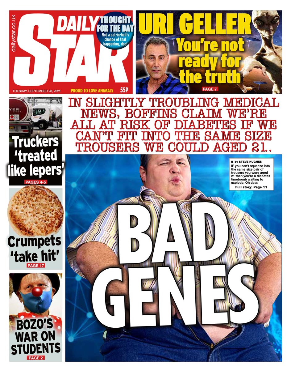 The Daily Star reports a scientific study that predicts people are at risk of diabetes if they cannot fit into the same size jeans they wore aged 21. Its headline? “Bad genes”.