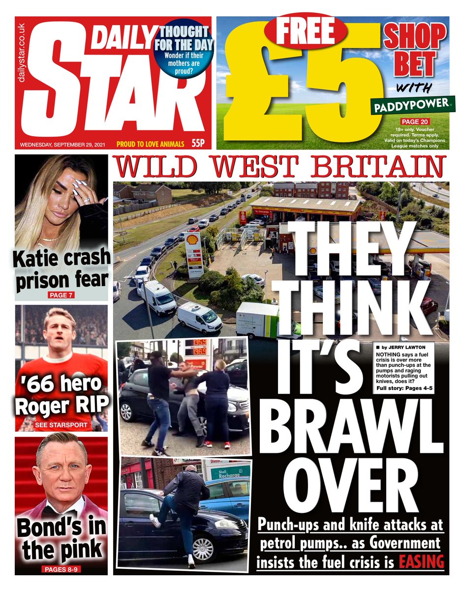 “They think it’s brawl over” says the Daily Star, which reports “punch-ups and knife attacks” on forecourts even as “government insists the fuel crisis is easing”.