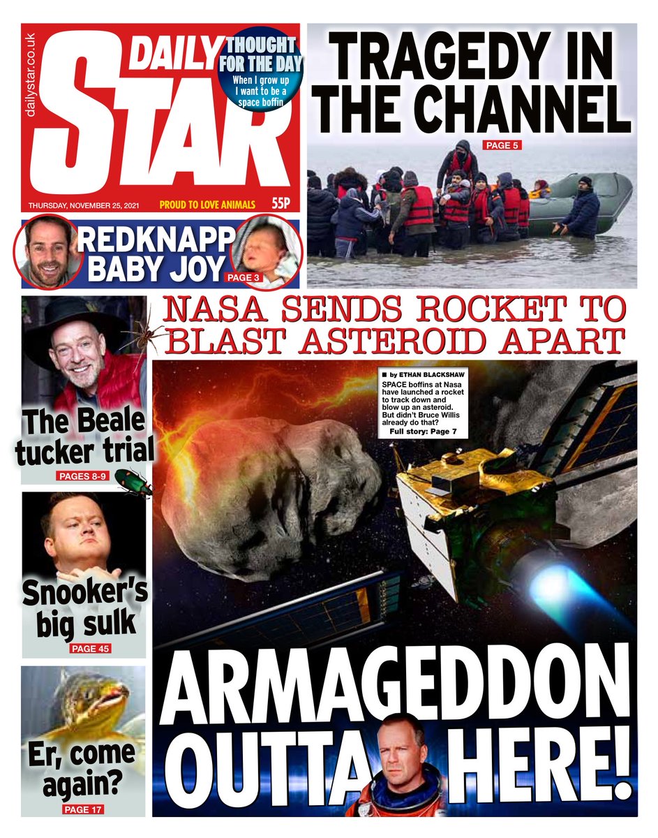 The Daily Star leads with the a report on the Nasa mission to test the feasibility of using a spacerocket to crash into an asteroid and alter its course.