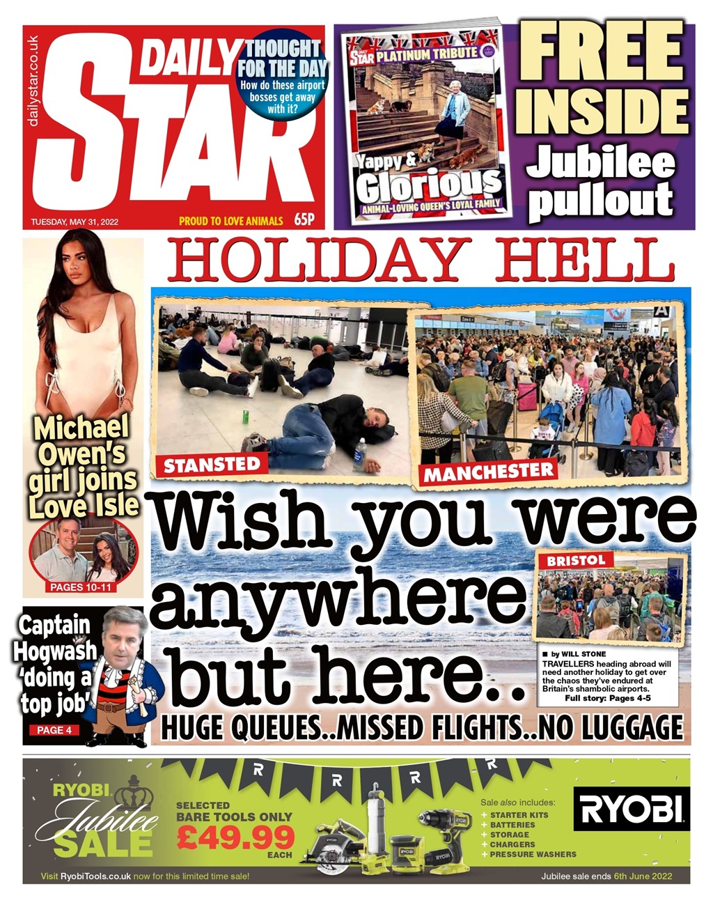 ‘Wish you were anywhere but here,’ reads the headline in the Daily Star, which shows pictures of “holiday hell” for passengers sleeping on the floor at Stansted airport and long queues for would-be flyers in Manchester and Bristol. The paper says travellers heading abroad will need another holiday to get over the chaos they’ve endured at Britain’s “shambolic” airports.