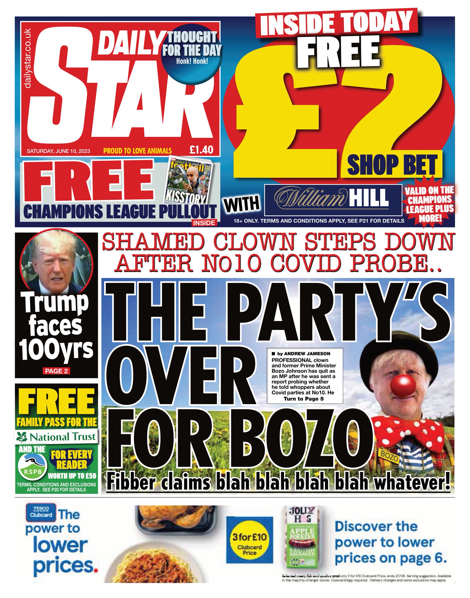A red nose has been super-imposed on the face of Mr Johnson, as the Daily Star publishes a damning assessment of the ex-PM who it describes as a “shamed clown” stepping down.