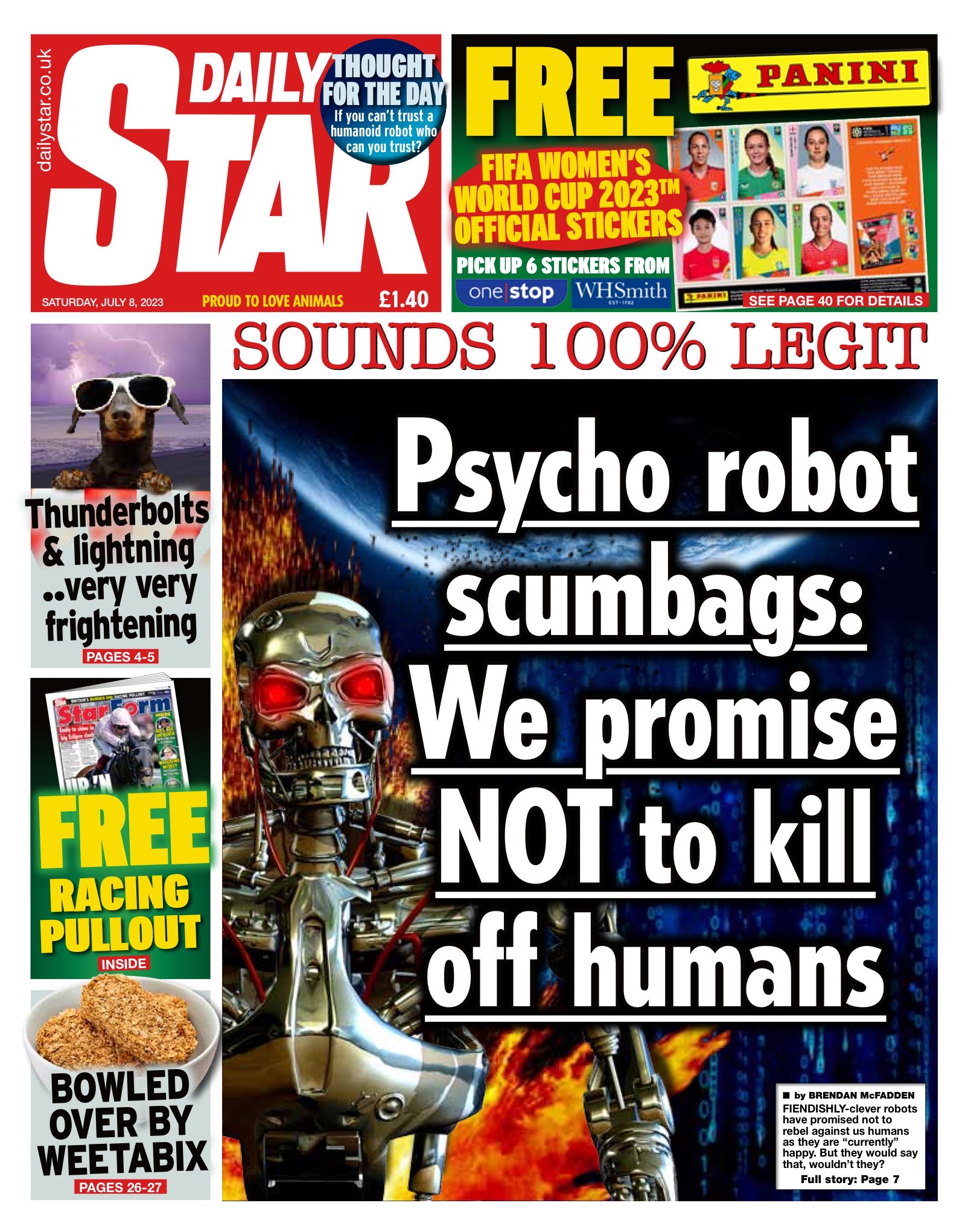 Meanwhile, the Daily Star claims that “psycho robot scumbags” have promised not to rebel against humans. The clever robots say they are currently happy, says the paper, which asks: “But they would say that, wouldn’t they?”
