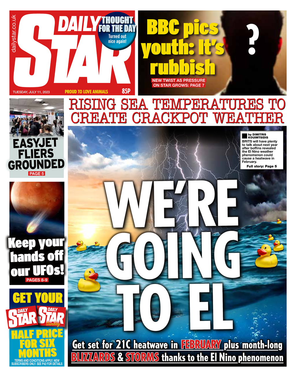 But it’s the worries over rising sea temperatures that have made the front page of the Daily Star. “We’re going to el” the newspaper’s front page headline reads, with warnings that the El Niño phenomenon could bring a 21C heatwave to the UK in February, creating “crackpot weather”.