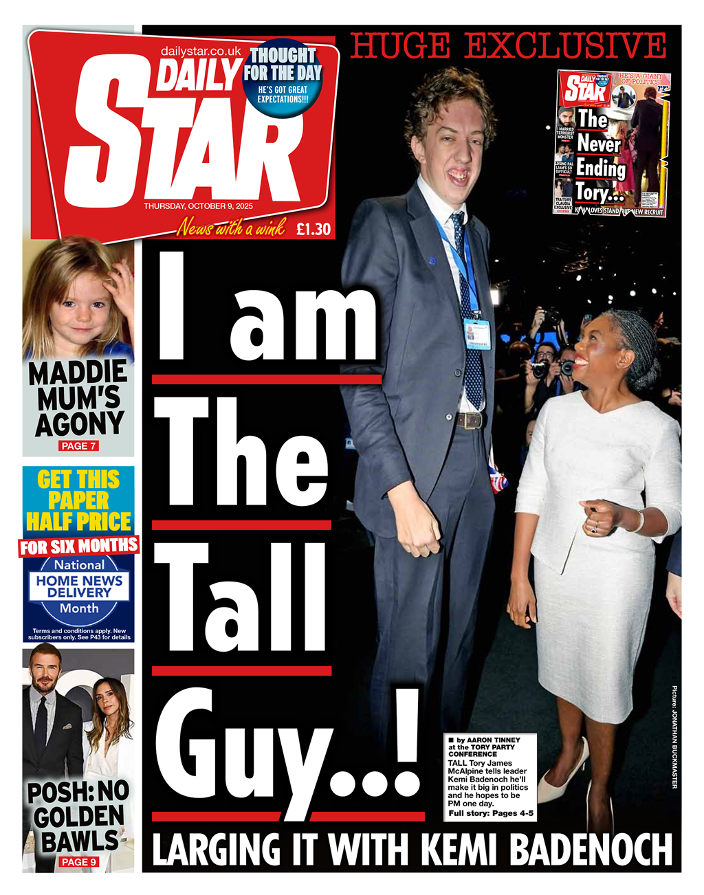 James McAlpine, billed as Britain’s tallest Tory at 7ft 2in, declares his ambition to become a political giant and take No 10. He outlines intentions to lead the country and boost his Westminster profile, pitching himself as a future PM contender.