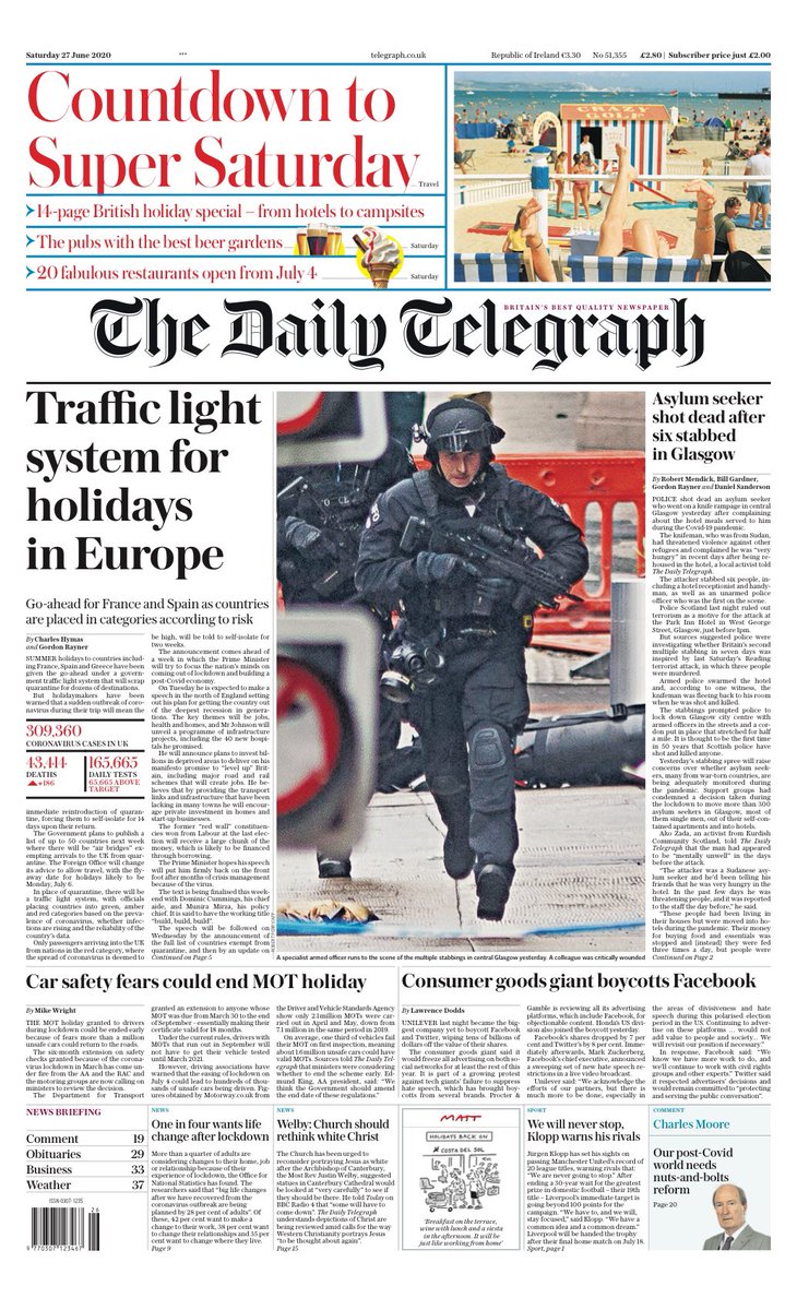 Most of the Daily Telegraph’s front page is taken up with a photograph of an armed officer responding to the stabbing attack in Glasgow on Friday. It, too, leads on Britons being given the “go-ahead” for summer holidays. It reports that the government’s traffic light system will be based on “the prevalence of coronavirus, whether infections are rising and the reliability of the country’s data”.