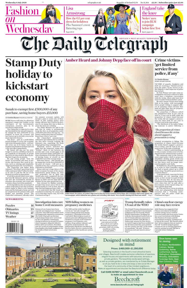 Home buyers are the focus of the Daily Telegraph front page, which says the chancellor’s statement will also include an immediate stamp duty holiday for purchases under £500,000. The paper says it will save buyers up to £15,000 and adds that the move could be a step towards slashing the property purchase tax permanently.