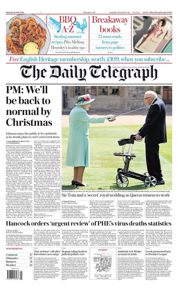 Like many of Saturday’s front pages, The Daily Telegraph leads with Boris Johnson’s announcement that the UK will be “back to normal” by Christmas. The public should start “looking ahead with optimism”, the paper quotes the PM saying, as he urged people to return to work from the start of August as advice to avoid public transport was rescinded. A photo of the Queen knighting Captain Tom Moore dominates most of the front pages.
