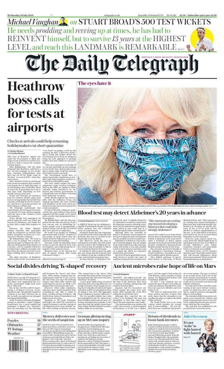 The boss of Heathrow Airport is urging the government to all allow passengers to be tested for Covid-19 on arrival, according to the Daily Telegraph. John Holland-Kaye tells the paper that Heathrow could have a test “up and running” in two weeks’ time – which would allow holidaymakers to be checked for £150 each.