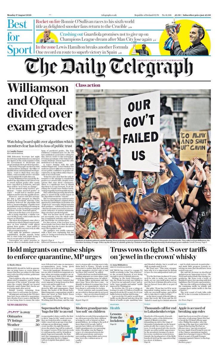Student protests also feature prominently on the front page of The Daily Telegraph, with a protester carrying a sign reading, “our gov’t failed us”. Meanwhile, Mr Williamson and exams regulator Ofqual are divided over exam grades, the paper reports. Board members at Ofqual want to ditch their own algorithm, the paper adds, after sources allegedly said that some members believe the system has led to a “haemorrhaging” of public trust in qualifications. Mr Williamson has repeatedly defended the algorithm as the fairest way to award student grades after exams were cancelled.
