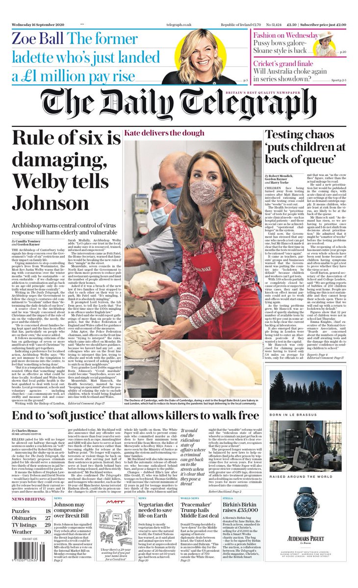 Archibishop of Canterbury Justin Welby will tell the prime minister that the new “rule of six” is damaging to communities, and urge him to take a less central approach to controlling virus, says The Daily Telegraph.