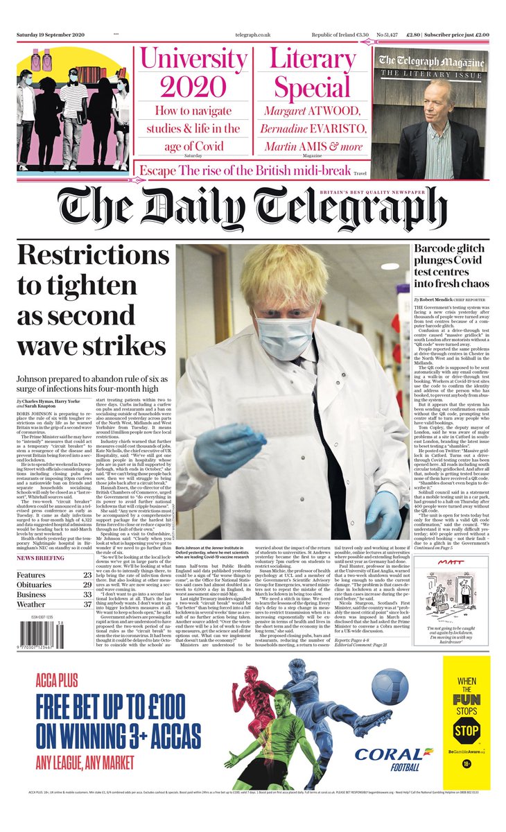 People in England could face tougher coronavirus restrictions – with ministers discussing options such as closing pubs and restaurants, imposing 10pm curfews or a nationwide ban on separate households socialising – reports The Daily Telegraph.