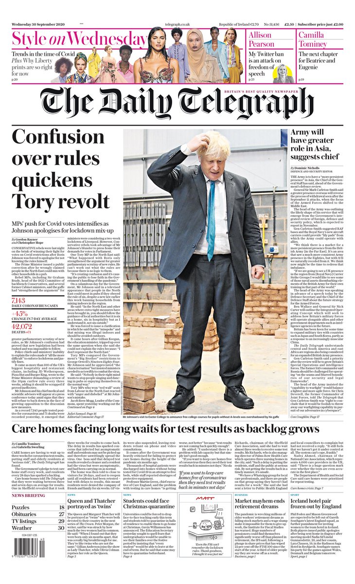 The Daily Telegraph says that Conservative backbenchers who are hoping for the right to vote on coronavirus restrictions appear to be on the brink of winning their argument, following the prime minister’s admission he did not correctly describe the rules in the North East.
