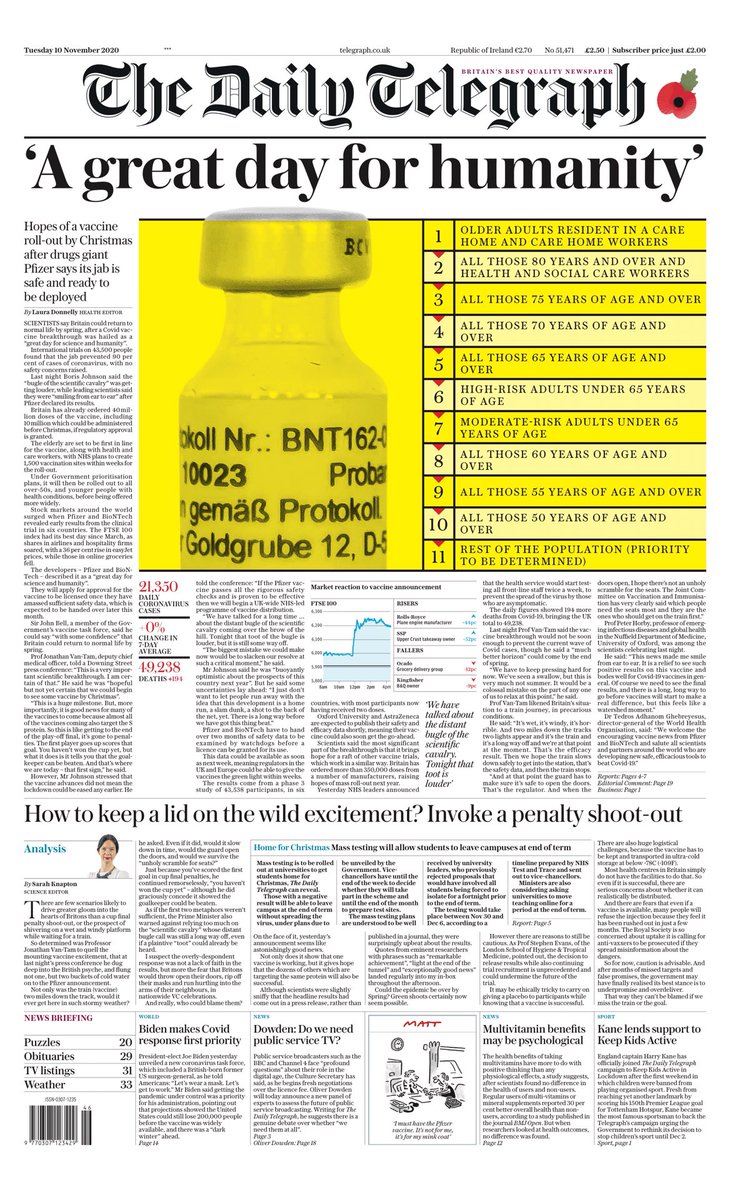 Britain has already ordered 40 million doses of the new vaccine, according to the Daily Telegraph. It also says the NHS has plans to create 1,500 vaccination sites within weeks in anticipation of the roll-out and is the only paper to use its front page to display the “priority list” of who will get the first jabs.
