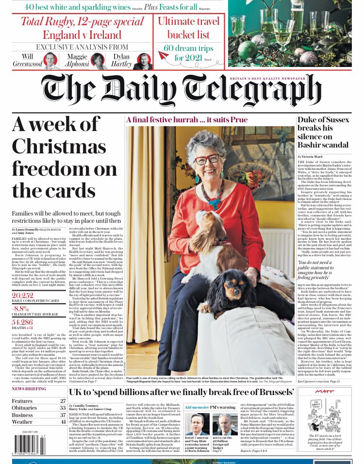 Families will be permitted to meet during Christmas, the Daily Telegraph reports, citing government plans due to be announced early next week. Boris Johnson is preparing to announce a UK-wide relaxation of the rules between 22 and 28 December, allowing several families to join in one “bubble”. However, the paper adds that the strength of the restrictions will be dependent on how well the public in England complies with the current lockdown, due to end on 2 December.