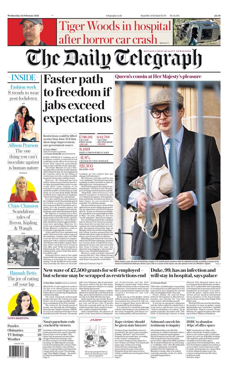 Wednesday’s front pages continue to focus on how the UK will emerge from lockdown. The Daily Telegraph claims the prime minister’s roadmap in England “could be accelerated” if data on the effect of vaccines is better than expected. The paper says it has been told by government sources that some of the timings set out by Boris Johnson on Monday could be reviewed.