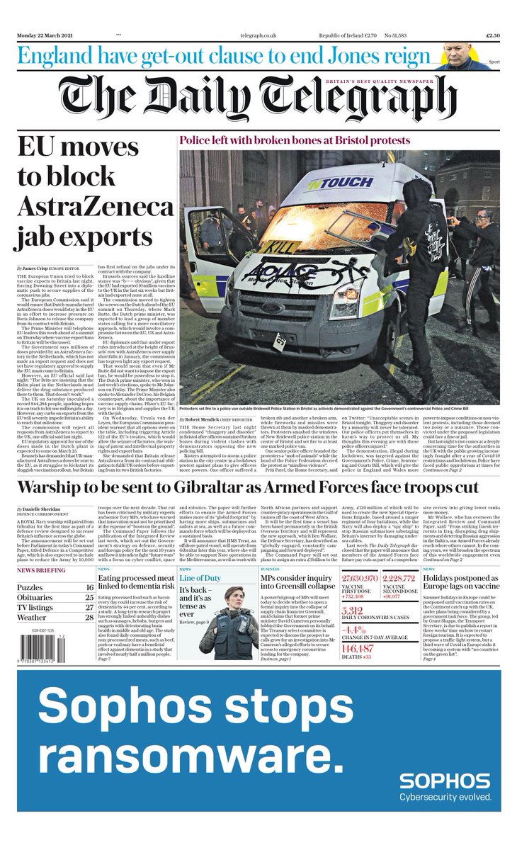 The EU’s threat to ban UK-bound vaccine exports also makes the lead of the Daily Telegraph, with the paper saying Downing Street has been forced into “a diplomatic push to secure supplies of the coronavirus jabs”. The newspaper is one of those to get pictures into its early edition of violent scenes from a Bristol protest against the Police and Crime Bill.