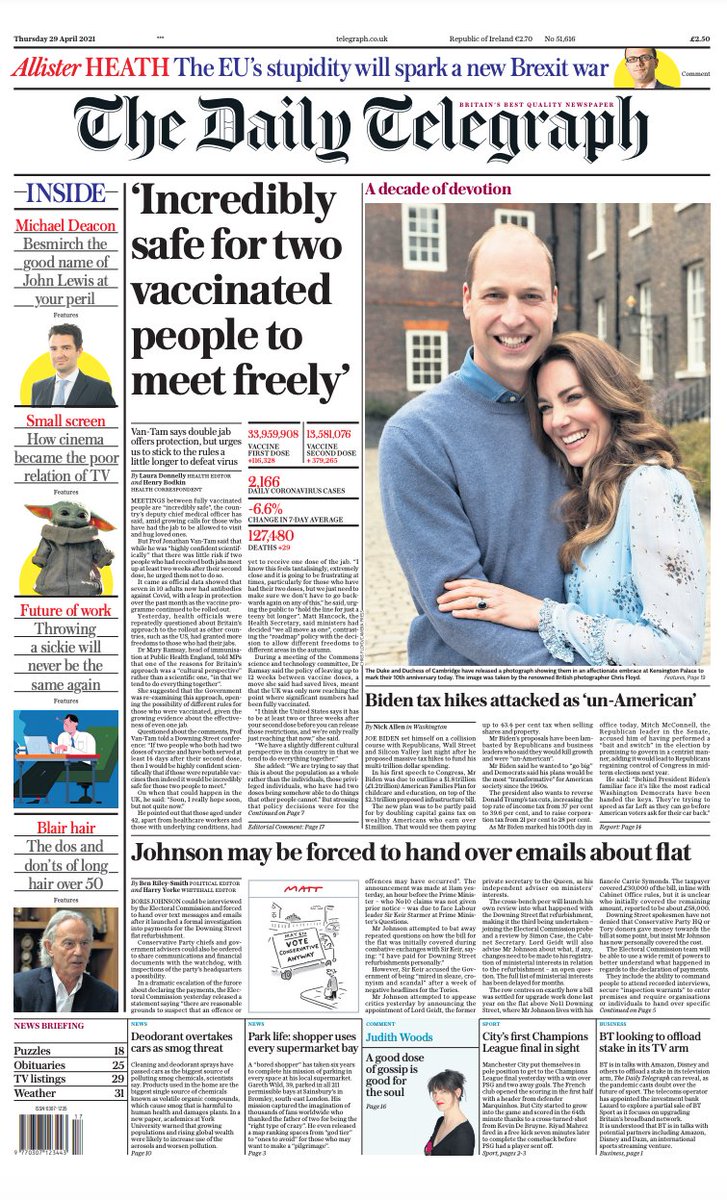 The Daily Telegraph leads on the comments of England’s deputy chief medical officer Prof Jonathan Van-Tam who says two-jab protection allows vaccinated people to “meet freely”. The paper says Prof Van-Tam believes there is little risk for those who have been fully jabbed to gather – but he urged them not to so. Its main image is of Prince William and Catherine in what the paper describes as an “affectionate embrace” as the couple mark 10 years of marriage..