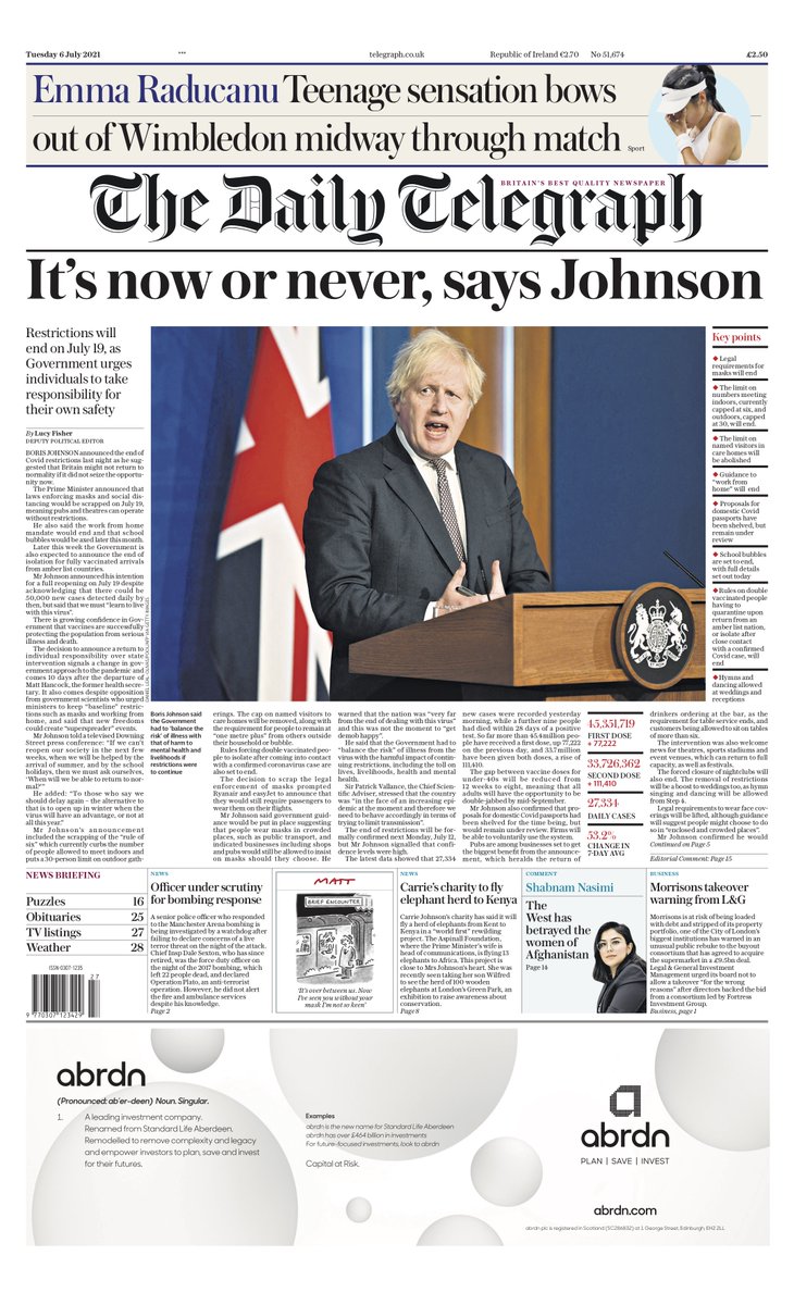 Nearly all the papers are leading on the same story – the announcement by Boris Johnson that he plans to scrap laws in England enforcing masks and social distancing on 19 July, meaning pubs and theatres can operate without restrictions. Under the headline “It’s now or never, says Johnson”, The Telegraph says the PM suggested that Britain might not return to normality if it did not seize the opportunity now. It quotes him as saying: “If we can’t reopen our society in the next few weeks, when we will be helped by the arrival of summer, and by the school holidays, then we must ask ourselves. ‘when will be able to return to normal?'”