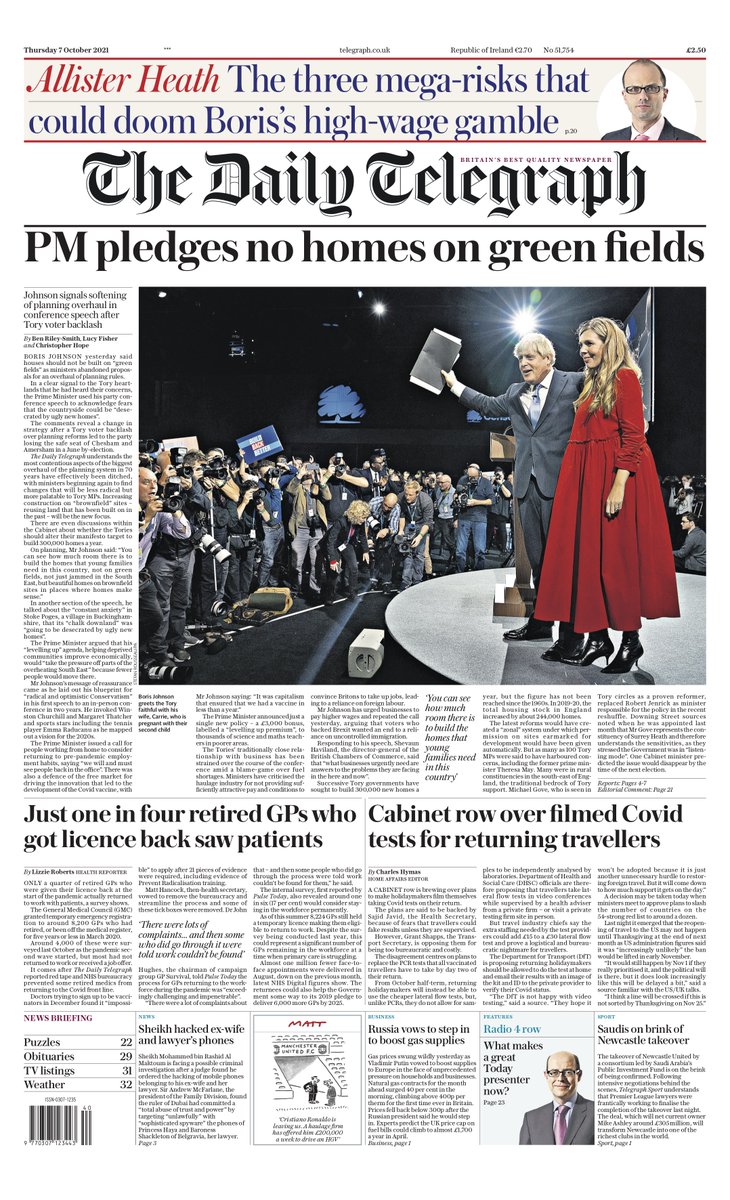 The Daily Telegraph front page says ministers have ditched the most contentious parts of their planning reforms as Mr Johnson signalled a softening of the government’s approach. The paper reports the prime minister acknowledged fears that the countryside could be “desecrated by ugly new homes” and promised that houses should not be built on green fields.