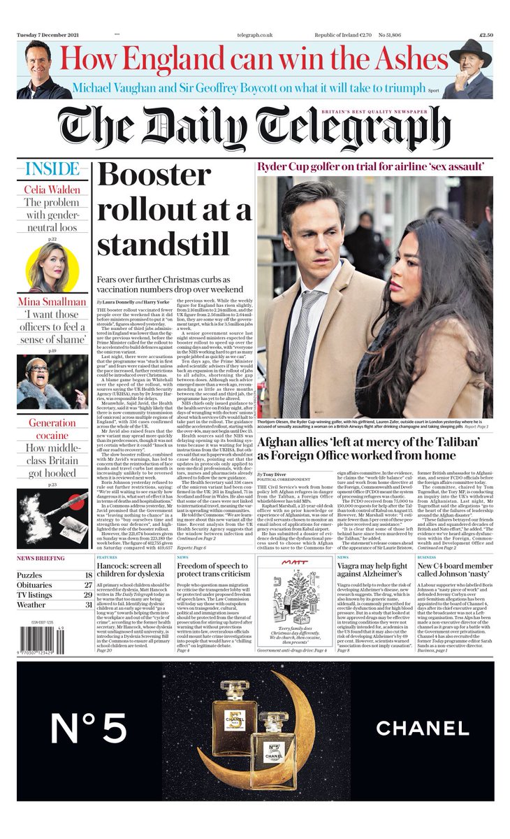 Meanwhile, the Telegraph leads on the rollout of Covid booster vaccines, which it describes as being at a “standstill”. The paper says the effort over the weekend led to fewer people being given third jabs in England than before the government called for the rollout to be accelerated last week.