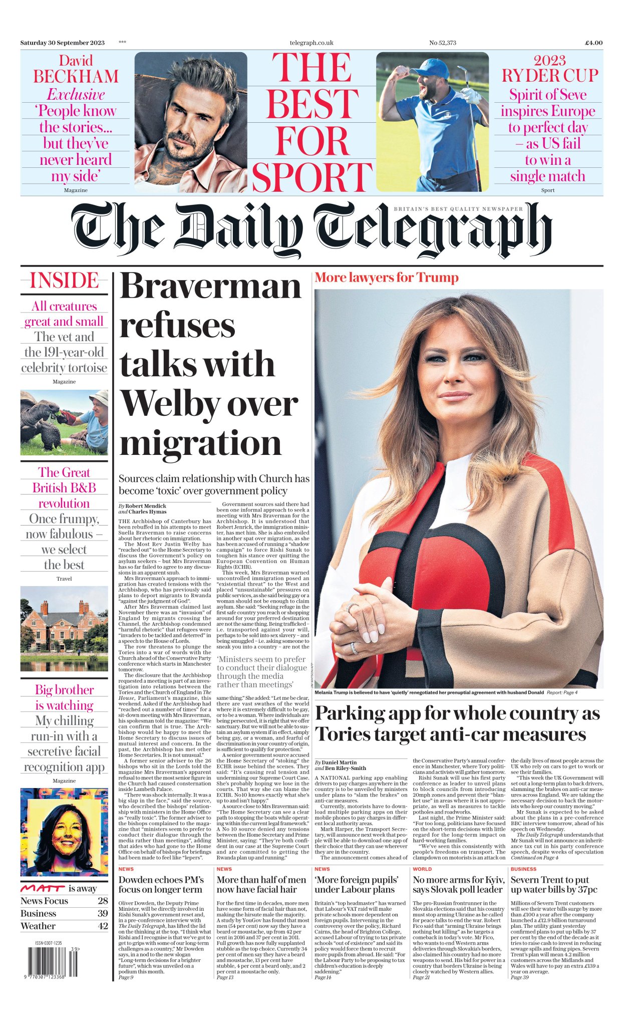 Home Secretary Suella Braverman has refused to meet Archbishop of Canterbury Justin Welby to discuss her rhetoric on immigration, the Daily Telegraph says. It also reports the government is planning to roll out a national parking app to replace the myriad of platforms motorists currently need to use.