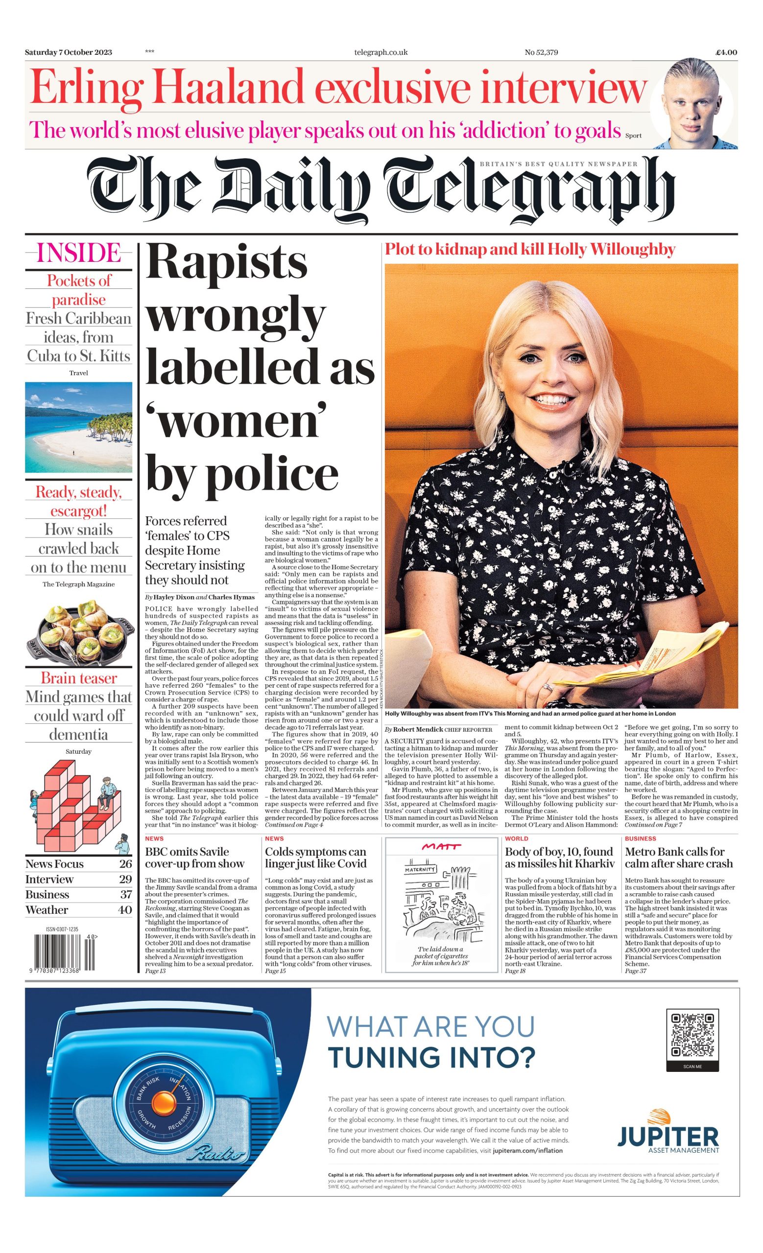The Daily Telegraph says police are wrongly labelling hundreds of suspected rapists as women. It says Freedom of Information requests show police forces referred 260 self-declared females to the Crown Prosecution Service to be considered for a rape charge. By law, rape can only be committed by a biological male, the paper notes. The Telegraph also carries Rishi Sunak’s words of support for Willoughby as he appeared on This Morning amid the news breaking about the alleged murder plot. Elsewhere, Manchester City footballer Erling Haaland tells the paper about his “addiction” to goals.