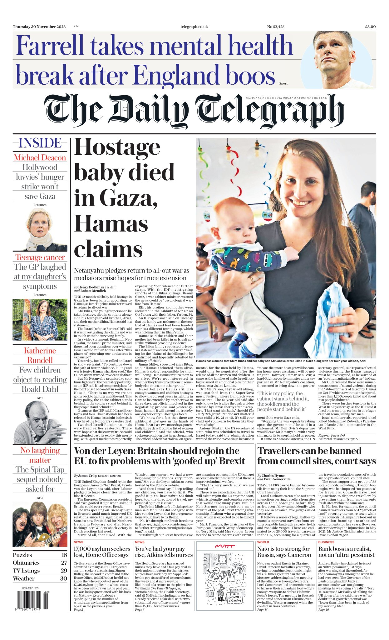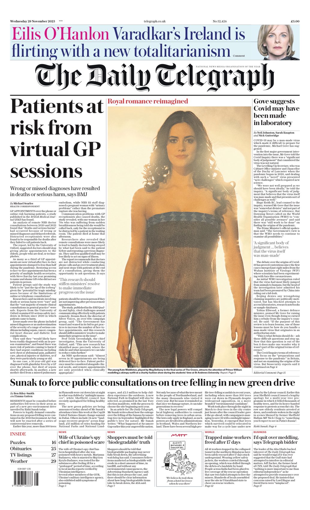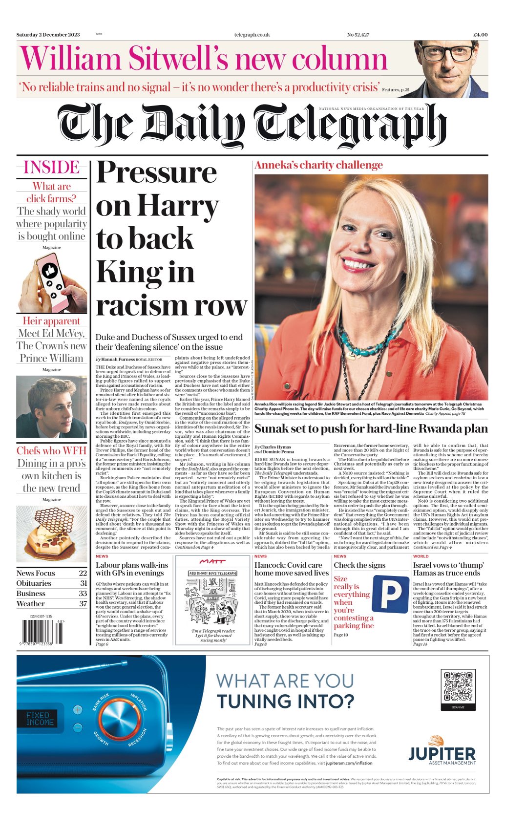The Telegraph leads with reports that the return of David Cameron has triggered an angry backlash among Brexiteer Conservatives. Also on the front page is an article based on an interview the paper has done with Immigration Minister Robert Jenrick who says that the Rwanda deportation plan must go ahead, even if it means leaving the European Convention on Human Rights for this to happen.