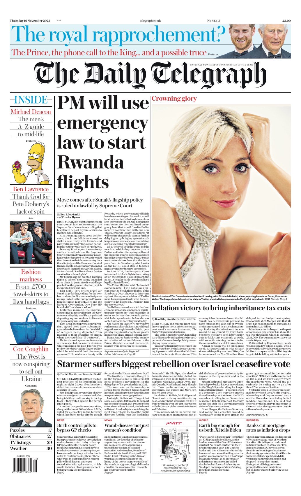 Prime Minister Rishi Sunak’s vow to introduce emergency legislation to mark Rwanda as a safe country after the UK Supreme Court ruled the government’s flagship asylum policy is unlawful, dominates Thursday’s front pages. The Daily Telegraph leads with this and the other big political news of the day – a Labour rebellion over the Israel-Hamas ceasefire vote.