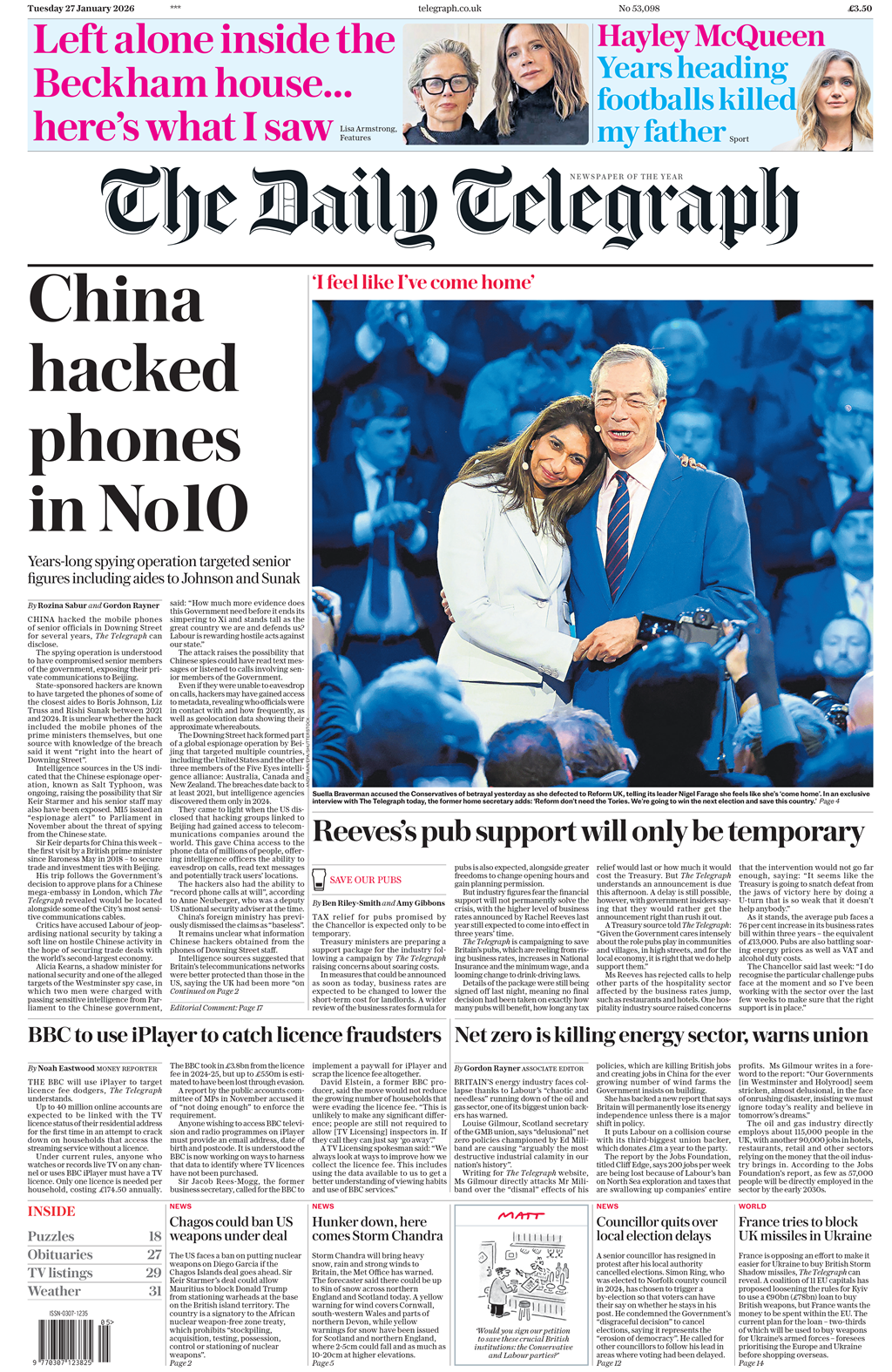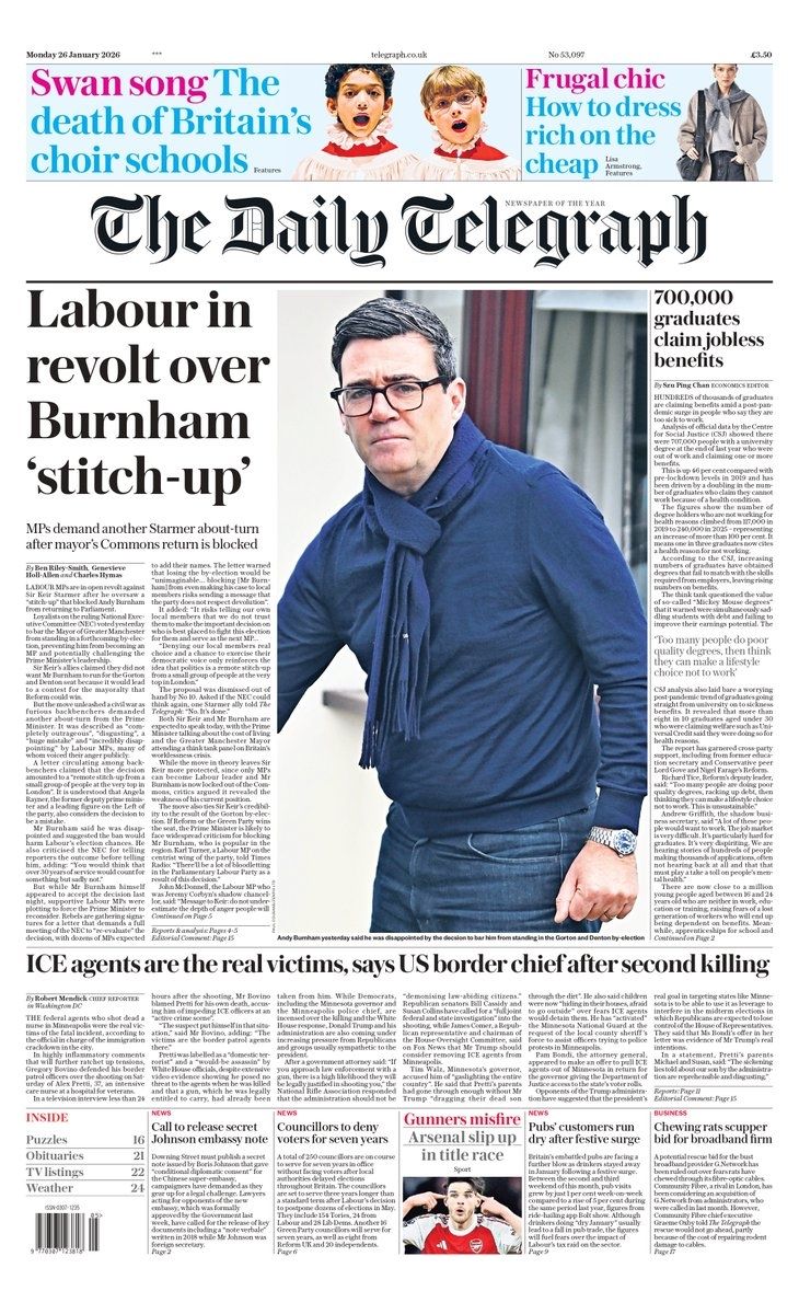 Daily Telegraph Front Page 27th of January 2026